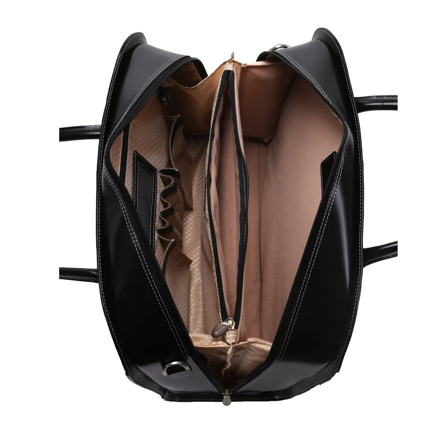 The McKlein USA Willowbrook Leather Detachable Wheeled Ladies’ Laptop Briefcase has a quick access front zipper pocket for essential items. Interior organizer with storage space for media devices, business cards, key holder and pens. Double compartment divided by secured zipper pocket for important documents. Built-in padded laptop compartment that protects most laptops up to 15.6″ in size. Dual Laptop Protection System uses a high-tech ABS frame to protect laptop from exterior impact and a sleeve with high-density foam to help absorb shock and prevent moisture intake. Smart Strap Attachment System allows transport on extended handles of other rolling cases.