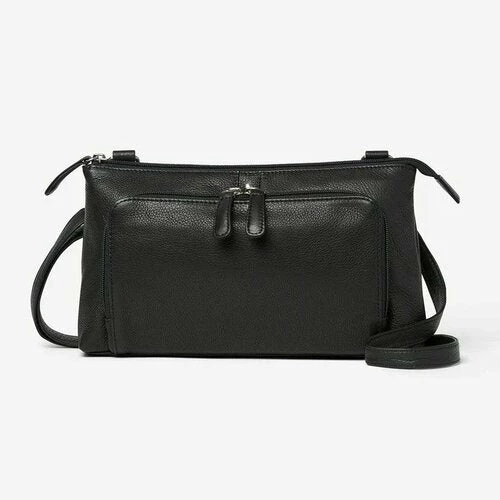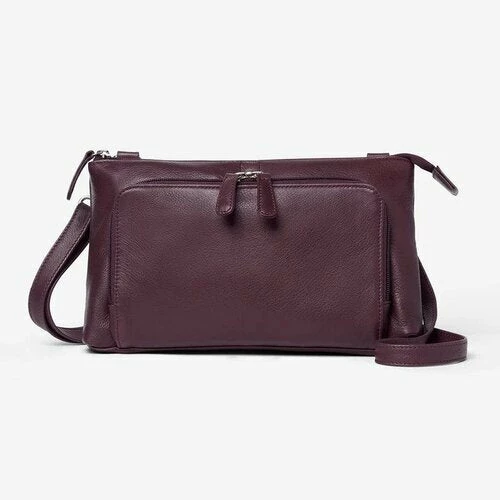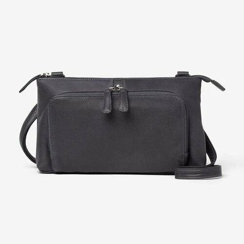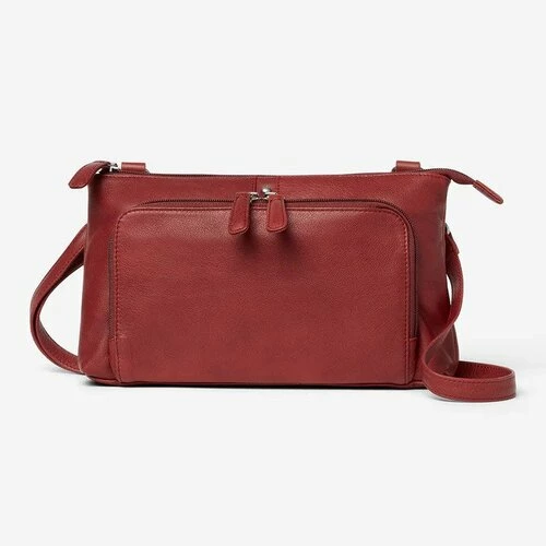 - The back of the bag has a two inch wide zippered compartment and an additional six inch zippered outside pocket. The all leather strap has a drop length from 20-30 inches.