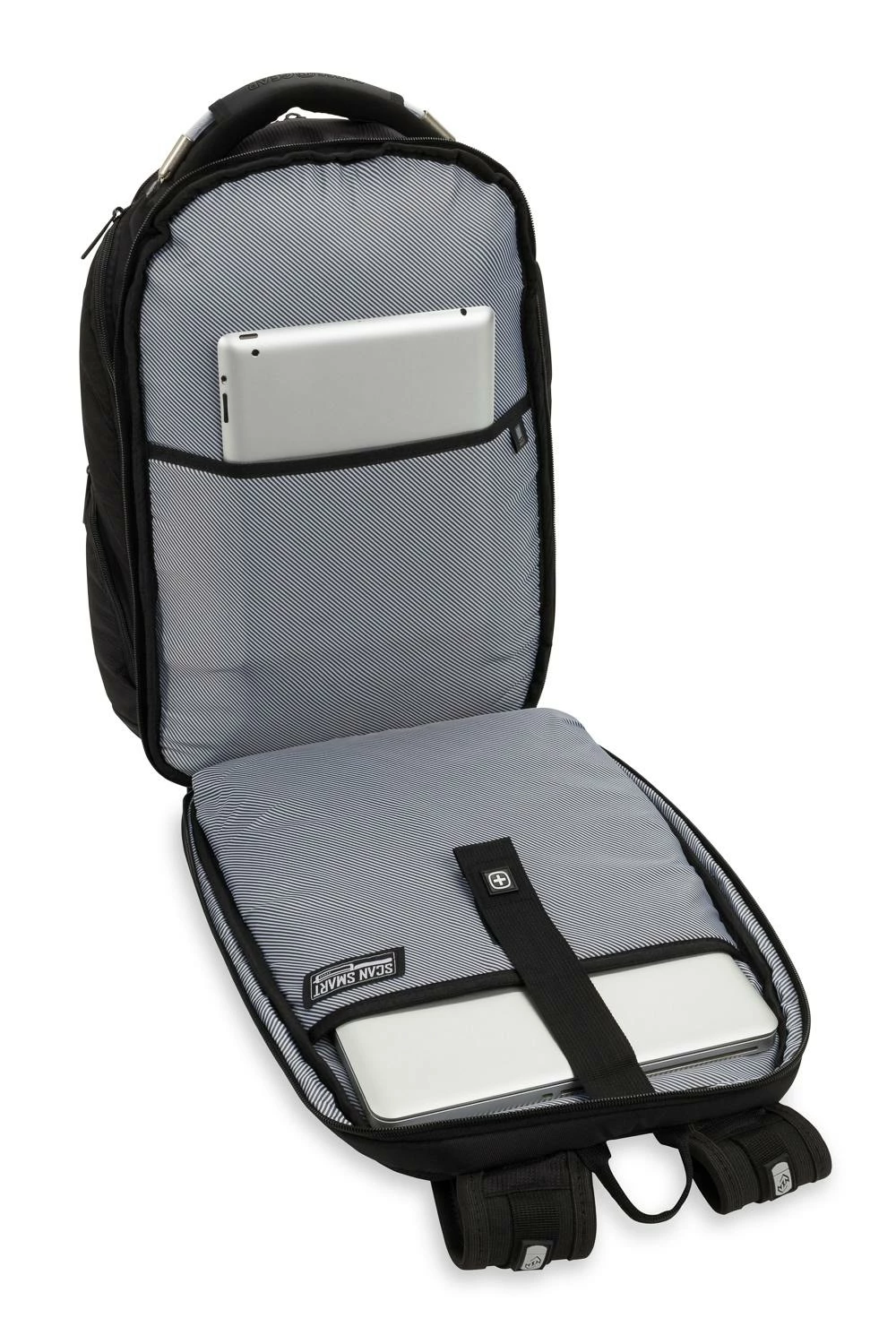 This rugged Swissgear 2762 ScanSmart Laptop Backpack is constructed to withstand life in motion. For on-the-go road warriors, this pack features our signature lay-flat ScanSmart compartment with a padded 16” laptop pocket and tablet pocket. Featuring a convenient front pocket and an organizer compartment with multiple divider pockets, leave your MetroCard, smartphone, and supplies ready whenever you are.