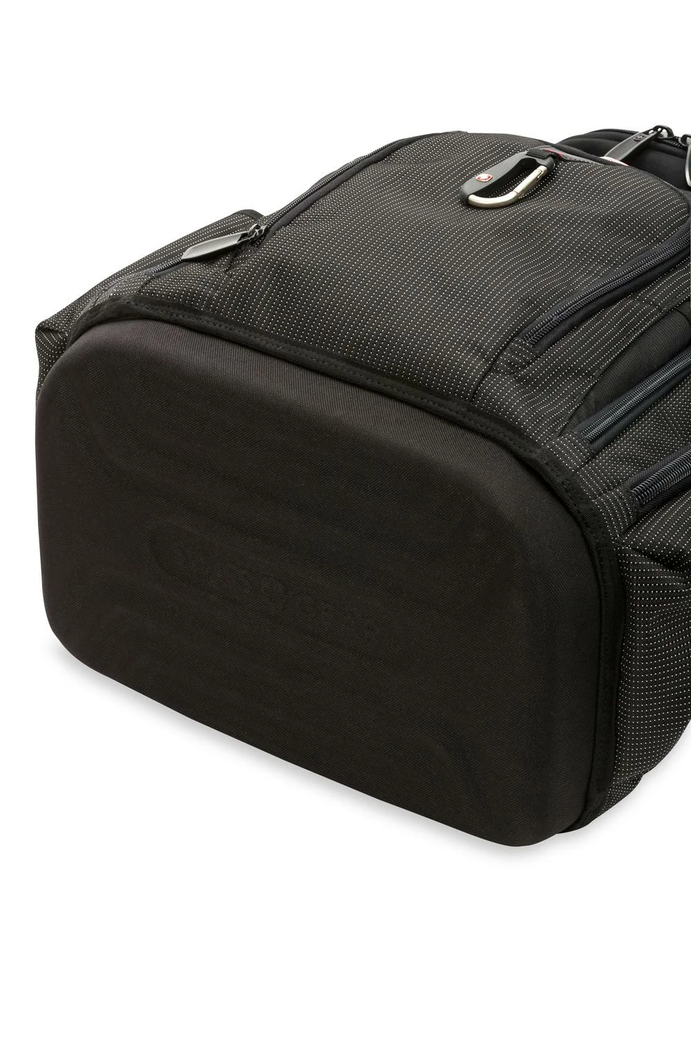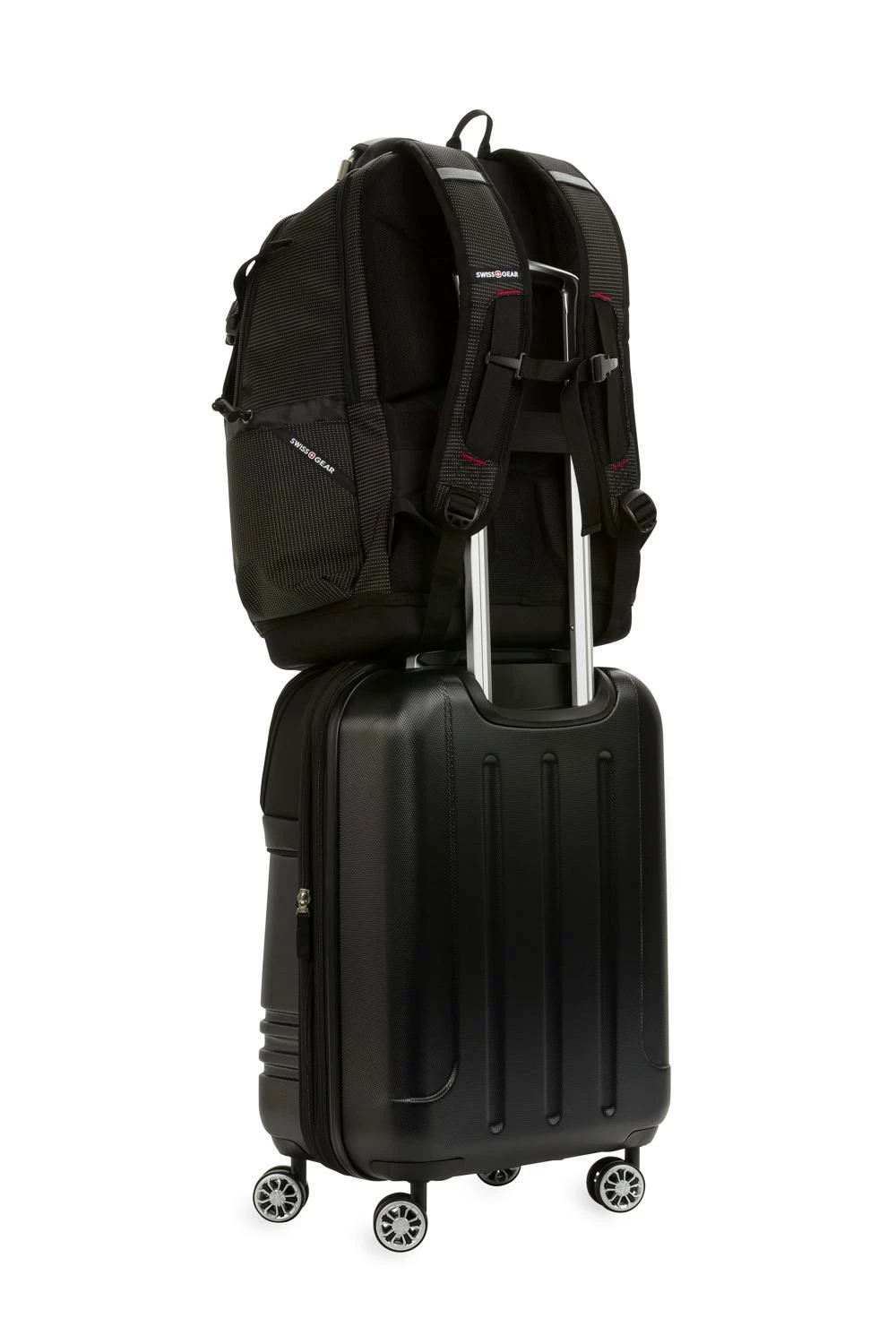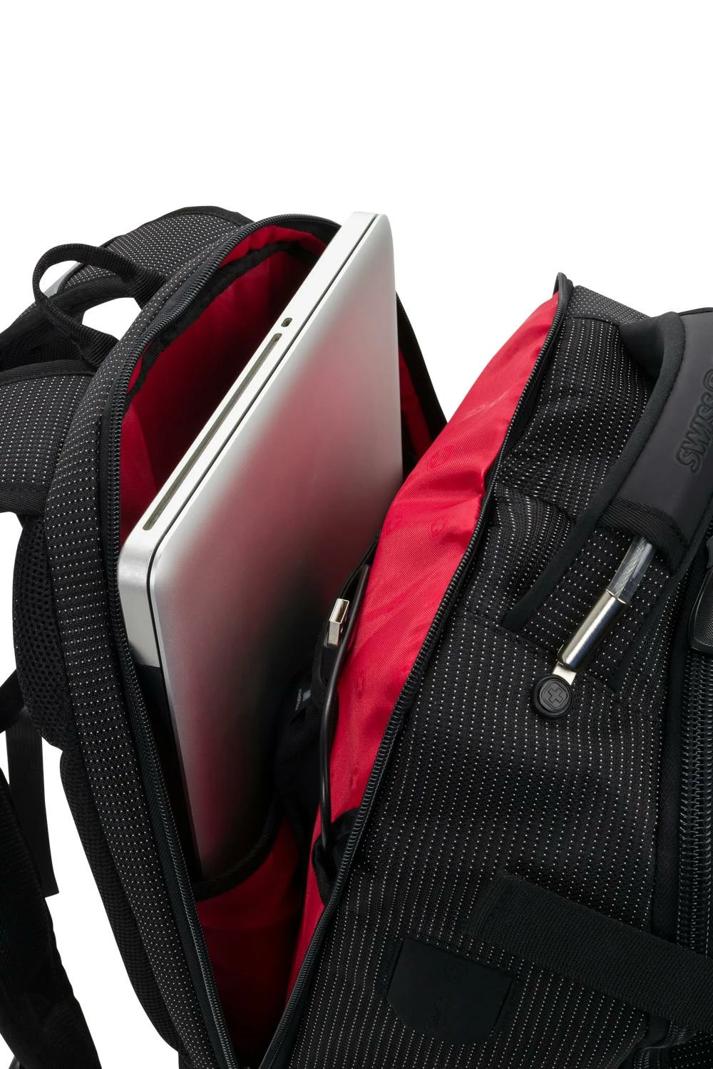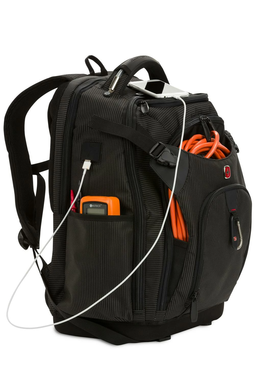 Constructed of a extra-rugged canvas fabric, this Swissgear 3636 USB Work Pack Pro Tool Backpack combines the portability of a toolbox with the modernity of a backpack. Its rugged construct features a designated 17” laptop compartment, a built-in USB port, and three zip compartments with more than 60 organizer slots for hand tools, nails, hammers, and drills. An external front pocket integrates 20 divider slots to accommodate a range of tool sizes while a second zip pocket includes two large slip pockets and multiple slots to store a measuring tape, rulers, screwdrivers, and other supplies. Inside the main compartment, find a removable grab-and-go tool caddy as well as a wet/dry PVC pocket and a hook and loop closure pocket.