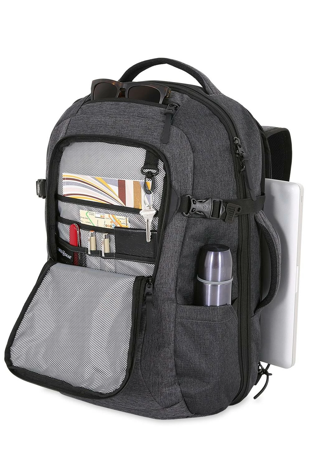 The Swissgear 6067 Getaway 2.0 Big Backpack transfers the same convenience from our iconic carry-ons. Its large silhouette is for the urban explorer who lives for smart transportation and functionality. Its features are unparalleled to any traveling backpack or daypack. Boasting a large main compartment that splits to expose a mesh pocket on either side, a cinched sleeve, and clothing tie-down straps, its front organizational compartment embeds pen dividers, and pockets that can be used to safely store a tablet, ID cards, and chargers.