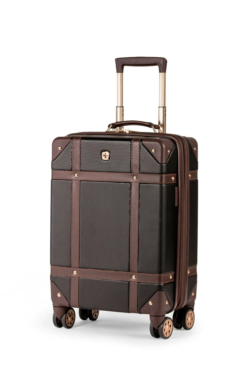 A retro case embellished with matching rose gold hardware and chocolate leather stripes, let this trunk upgrade your travel experience. The Swissgear 7739 19″ Expandable Trunk Carry On Spinner Luggage splits into a functional abode to accommodate your must-haves. Featuring elastic tie-down clothing straps to ensure stable transportation of your clothes, it also entails a side packing pocket, two mesh elastic pockets, and a large zippered packing compartment.