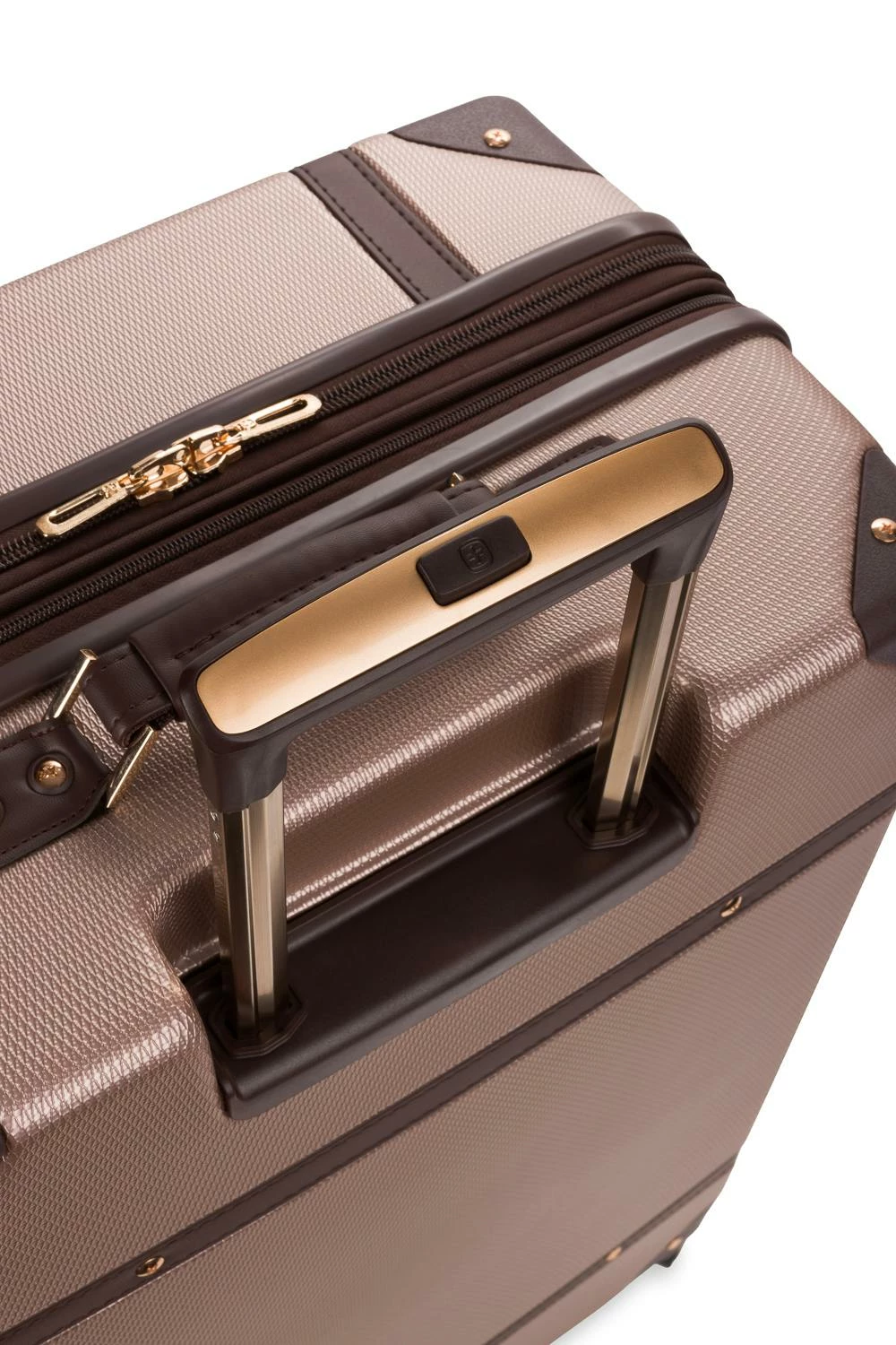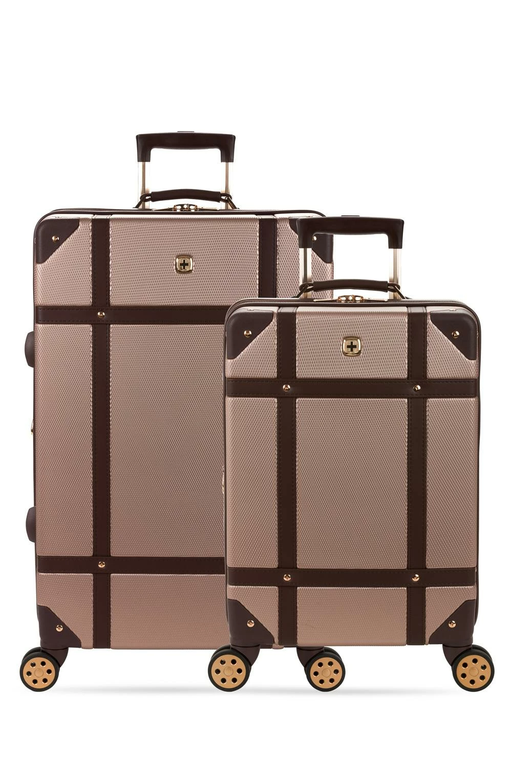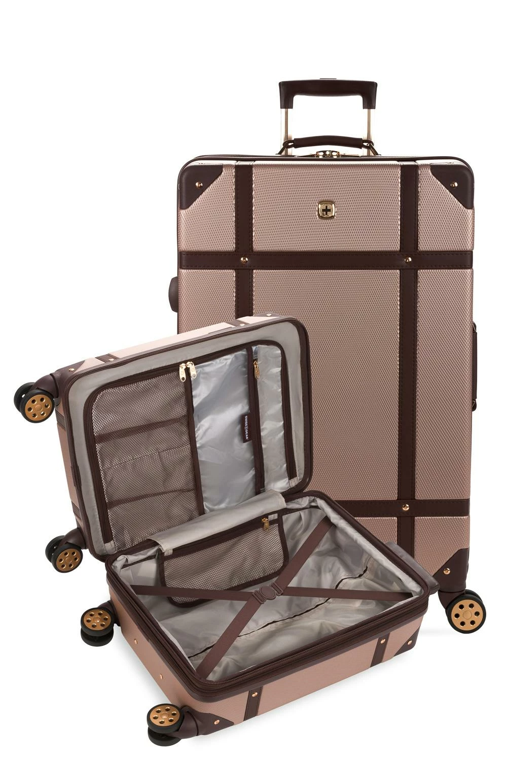 A retro case embellished with accent hardware and a stylish stripe design, let this modern luggage collection upgrade your travel experience. The Swissgear 7739 Expandable Trunk 2PC Spinner Set consists of a carry-on and checked luggage — the 19” Expandable Trunk Carry On Spinner and the 26” Expandable Trunk Spinner Luggage– that split into a functional abode to accommodate your must-haves. Featuring elastic tie-down clothing straps to ensure stable transportation of your clothes, it also entails a side packing pocket, two mesh elastic pockets, and a large zippered packing compartment.