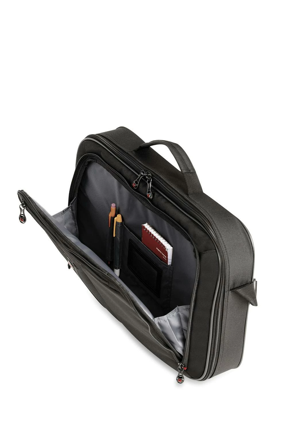 Organize your devices inside this contemporary Swissgear Jasper Laptop Business Case. Designed with stylish polyester and leather piping, it’s guaranteed to last through years of travel or commuting. Created for on-the-go use, it has a large front zip pocket for essentials and a large expandable organizer compartment to store your ID and office supplies.