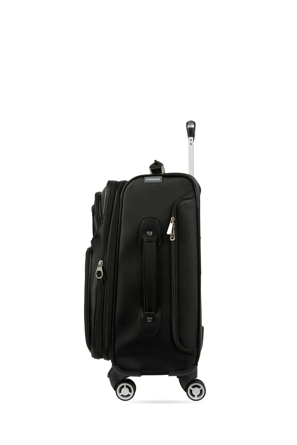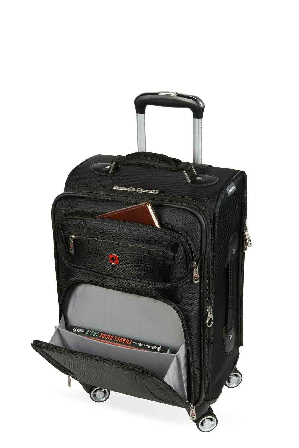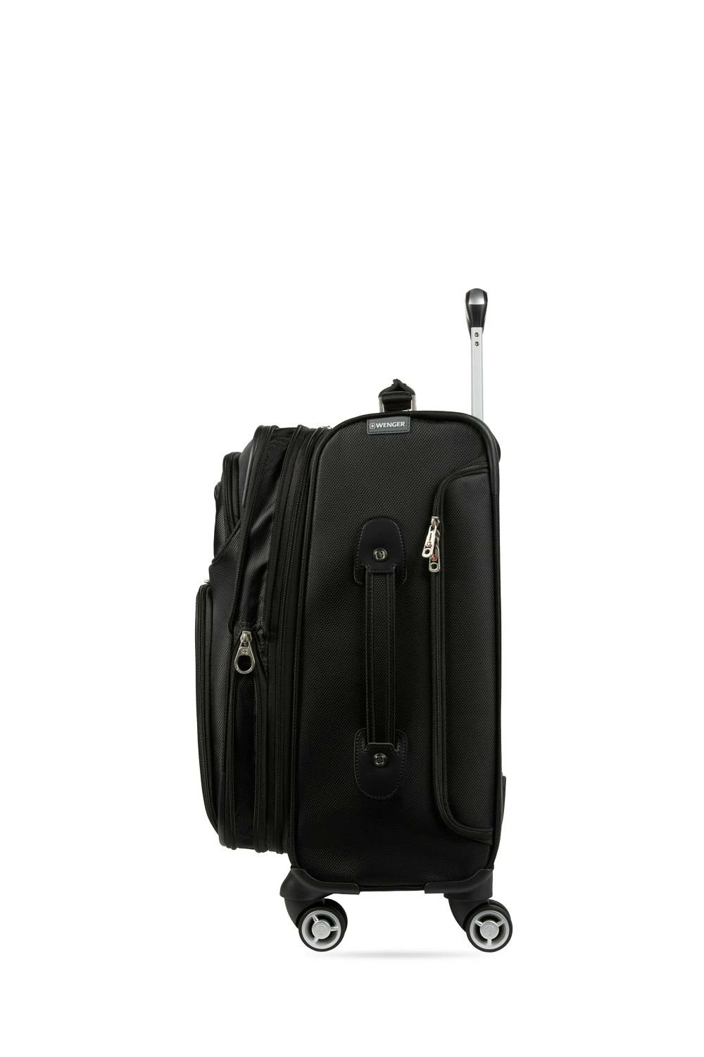 Expand your horizons – and your luggage, with the Wenger Identity Expandable Carry On Spinner. This soft-sided carry on suitcase expands when needed to increase packing capacity and keeps you organized with lots of pockets, inside and out. A padded laptop pocket is uniquely accessible from an external side zipper for ultimate convenience. A large, zippered, exterior front pocket has a built-in divider for files, books, paperwork, or even a sweater, and medium and small zippered front pockets provide extra space and quick access to often-used items.