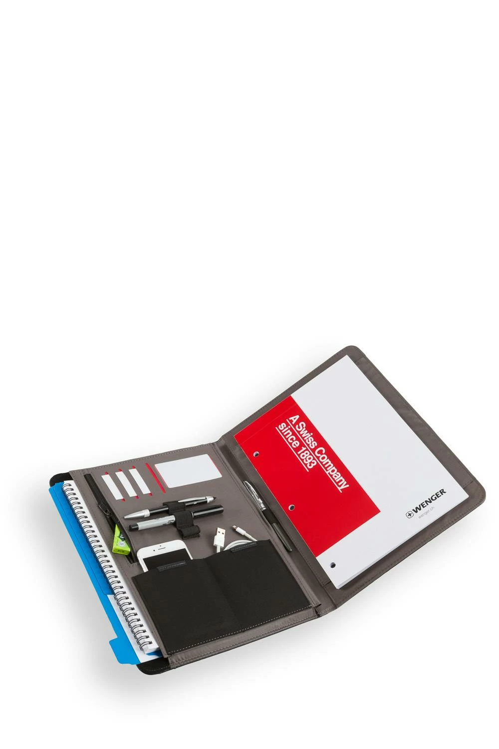 Show your flair for business with the Wenger Merit Padfolio that keeps your documents and essentials neatly stored and easily accessible. For simple note-taking there’s a refillable lined notebook, while the business organizer for your tech, a USB or pen loop, zippered accessories pocket and slots for business cards mean you can breeze through meetings feeling fully prepared and confident.