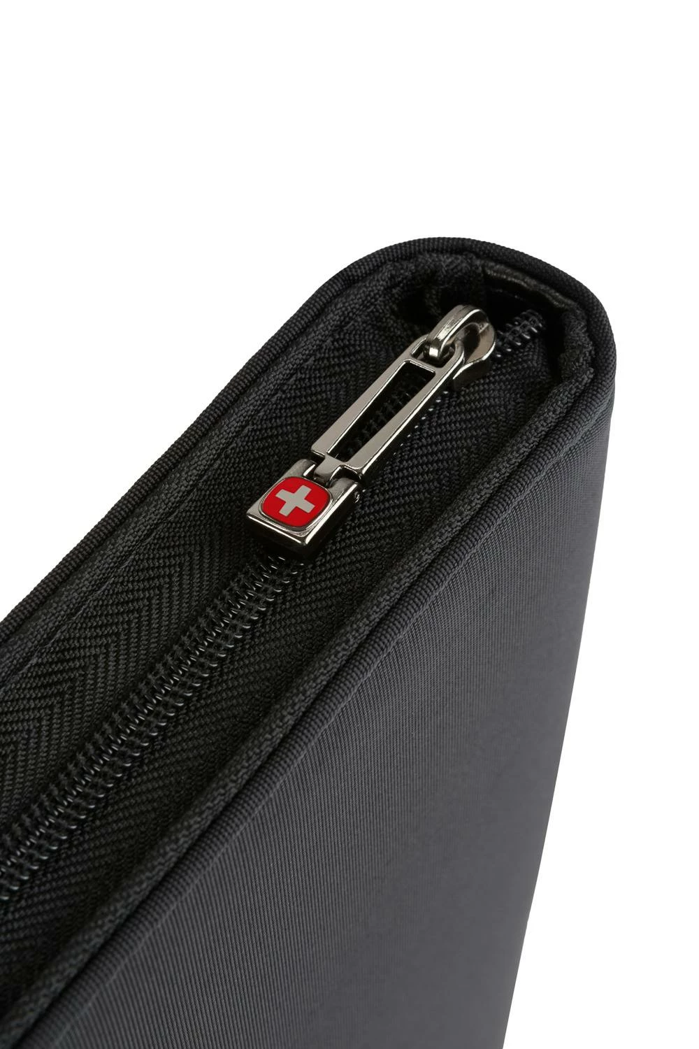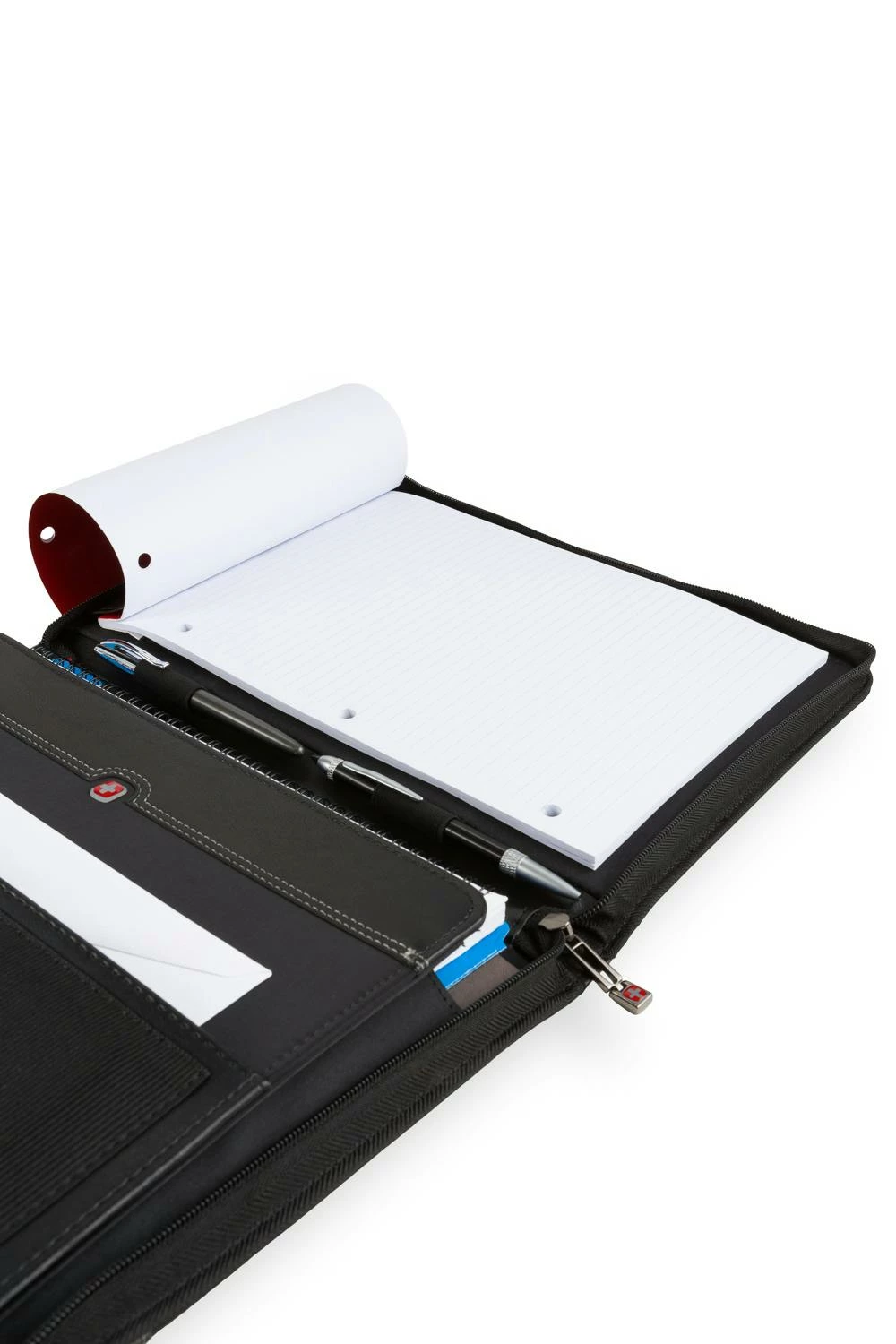 Show your flair for business with the Wenger Objective Zippered Padfolio that keeps your documents and essentials neatly stored and easily accessible. For simple note-taking, there’s a refillable lined notebook, while the business organizer for your tech, a USB or pen loop, zippered accessories pocket and slots for business cards mean you can breeze through meetings feeling fully prepared and confident.
